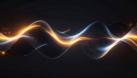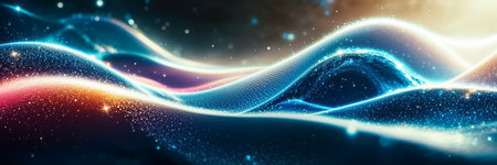 Abstract glowing waves of vibrant light and shimmering particles flow across a dark background.