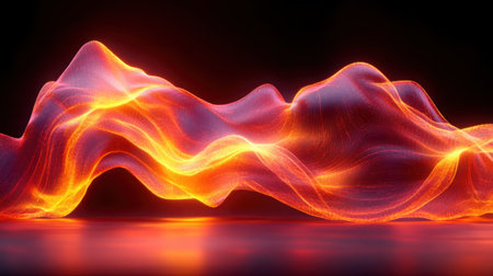 An abstract digital illustration showcases a flowing wave design, rendered in vibrant neon colors against a dark backdrop. The composition features dynamic lines and curves, creating a sense of movement and energy. Suitable for use in various visual communications, the design offers potential applications in modern design and technological projects.