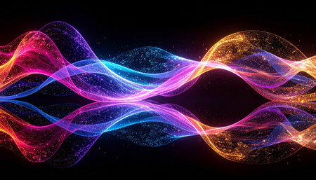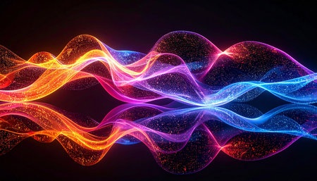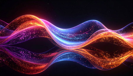 Vibrant neon waves with glittering particles flow across a dark background with reflections.