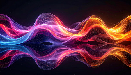 Abstract glowing neon waves in orange, yellow, blue, and purple with glitter particles reflected.