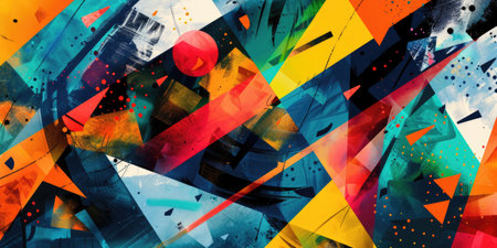 Bright colors and various shapes fill this abstract painting, creating a visually dynamic composition, Experiment with abstract shapes and forms inspired by sports