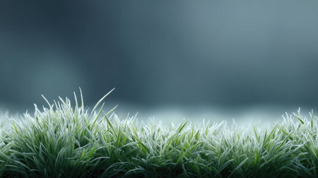 A tranquil scene featuring frost-covered grass, showcasing the natural beauty of a chilly morning. The blurred background adds an ethereal touch to the atmosphere.