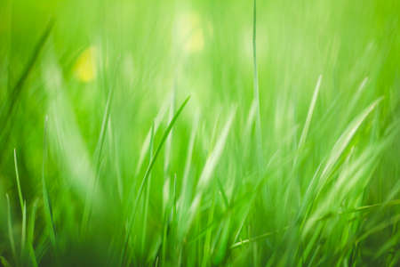 Green grass texture as background. Perspective view and selective focus. artistic abstract spring or summer background with fresh grass as banner or eco wallpaper. Leaves blur effect. Macro nature