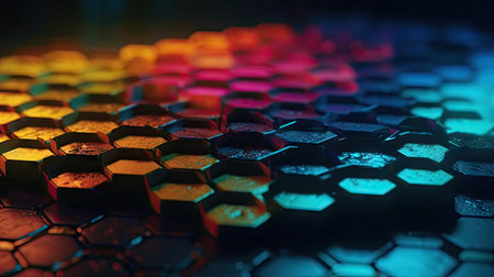 This digital artwork features a vibrant hexagonal pattern with an alluring neon glow, creating a futuristic surface full of colors and reflections.