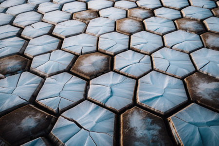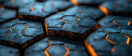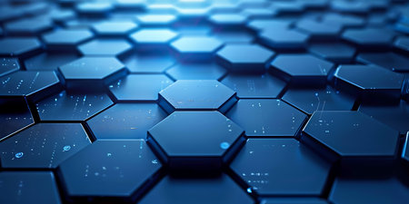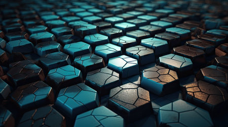 A metallic surface with a repeating pattern of hexagonal tiles, each with a different shade of metallic sheen and glowing blue accents, creating a high-tech look.