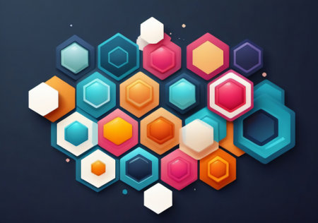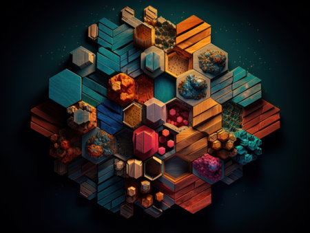 A vibrant arrangement of hexagonal shapes in various colors creates a striking abstract pattern, blending shades of blue, orange, and purple for a modern and artistic effect..