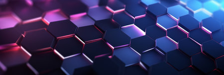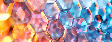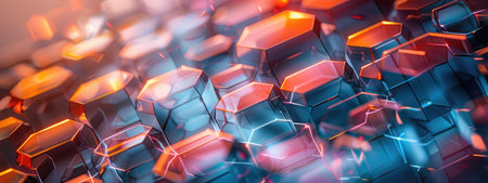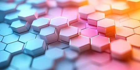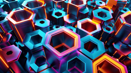This image showcases a close-up of a digital hexagonal structure. The artwork features a gradient of colors including blue, purple, and orange. The composition highlights a pattern of interlocking shapes and neon lights. Ideal for representing technology, data, or modern design concepts, it could be used for various editorial or commercial projects.