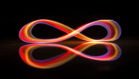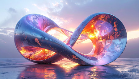A stunning infinity symbol made of translucent materials shines with vibrant colors against a dark backdrop, creating beautiful reflections.