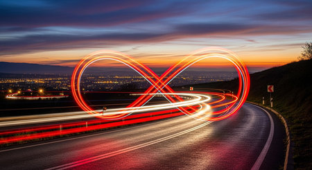 car light trails create an infinity symbol on a highway at dusk, with a city skyline in the background