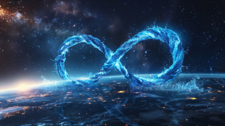 A blue infinity sign with a blue line in the middle with galaxy space om background