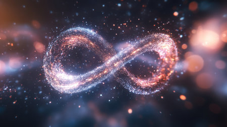 A glowing golden infinity symbol floating in space, surrounded by soft bokeh lights, symbolizing the eternal nature of the universe.