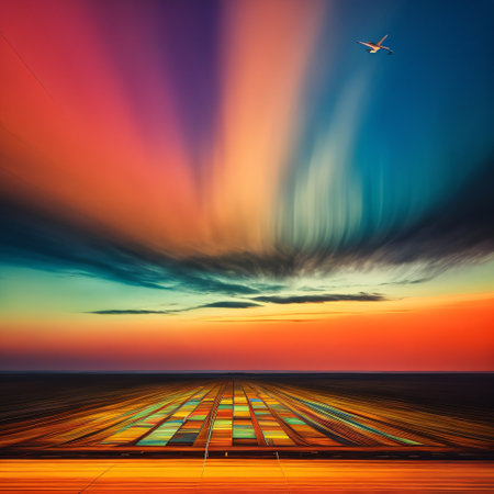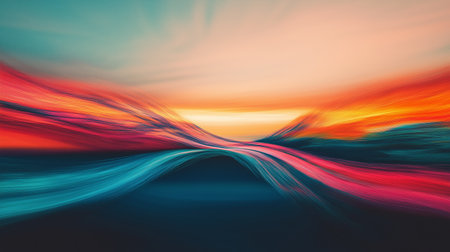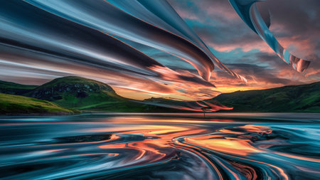 Vibrant abstract sunset with swirling colors over a calm horizon blending reds, blues, and oranges in the evening sky