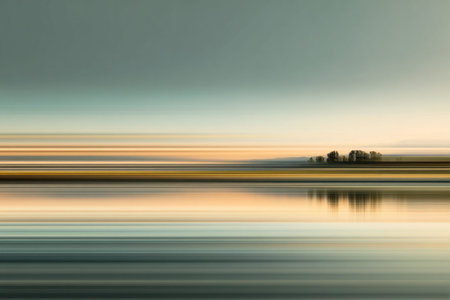 Tranquil landscape with soft hues and gentle gradients, captured through telephoto compression, features serene reflections on water, creating a peaceful and calming ambiance