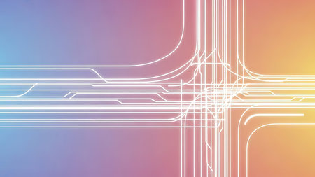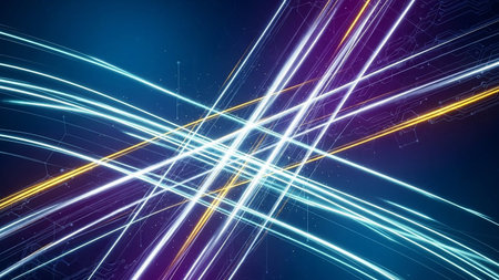 Dynamic neon streaks and shimmering lines weave intricate patterns against a dark backdrop, evoking a high-tech, cybernetic ambiance perfect for digital innovation t