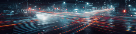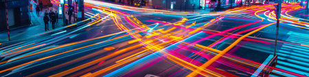 City lights creating dynamic light trails at a busy intersection depicting speed and modern life. Urban intersection showcasing rapid light trails and motion blur