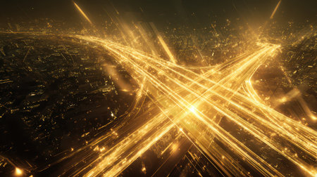 Nighttime aerial view of a busy highway intersection in a city showcasing traffic flow and city lights. Concept Nighttime Photography, Cityscape, Aerial View, Traffic Flow, City Lights