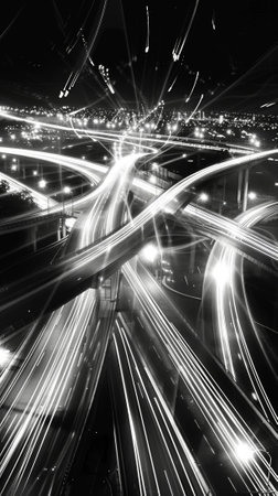 A visual representation of the interconnectedness of our world with intersecting light trails creating a complex and beautiful network. Black and white art.