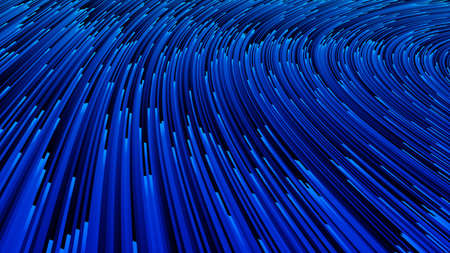 Blue illustration with lines. Turquoise, cobalt, navy speed line or wind motion abstract background. Glowing shiny energy waves on dark blue backdrop, digital halftone pattern