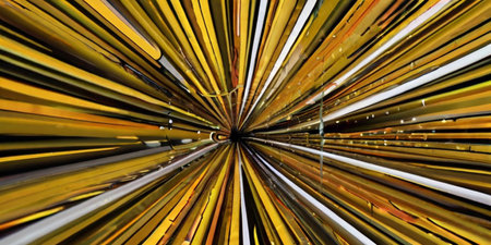 This image captures a mesmerizing burst of light that radiates from the center, creating a stunning display of blue and gold streaks. The vibrant lines spread out in all directions, evoking a sense of energy and movement. The contrast between the dark background and the bright, colorful lines adds to the visual impact, making it appear as if the light is exploding or spreading outwards in a cosmic dance.