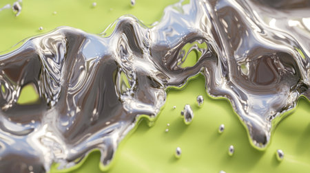 A stunning visualization of metallic fluid cascading over a bright green surface, highlighted by reflections and bubbles. This captivating abstract image showcases texture and movement.