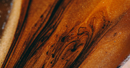 Paint stream defocused. Lens fluid. Glitter trickles flow particles pigment texture. Black brown orange color abstract background.