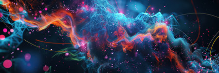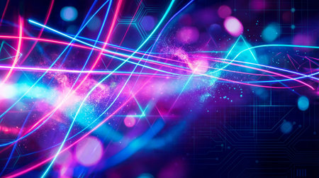 This digital artwork showcases a futuristic style with electric neon colors, creating a dynamic and energetic mood. Perfect for enhancing nightlife and entertainment marketing materials, event promotions, and digital displays. The vibrant lighting effect appeals to the youth and entertainment industries. AI-generated digital illustration. AI-generated illustration.