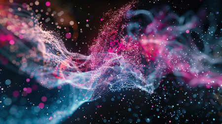 An abstract visualization of flowing particle waves, intertwined in a dance of pink and blue hues with a bokeh effect, suggesting movement and energy.