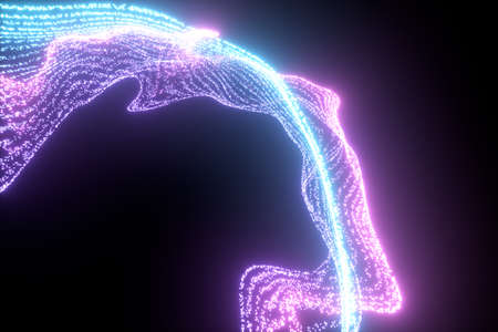 Neon glowing twisted cosmic lines on the glossy surface. Turbulence curls flow colorful motion. Fluid and smooth astronomy vortex swirl structure. 3d rendering Abstract creative modern background.