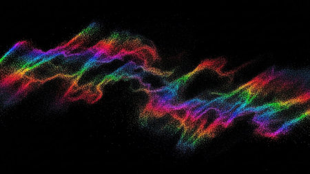 This abstract presents a complex interplay of colorful particle streams weaving together to form organic, fluid shapes. Against a deep black backdrop, the vibrant reds, oranges, yellows, greens, blues, and purples of the particles create a vivid contrast. The conveys a sense of energetic motion and intricate with the fine particles creating a textured, almost smoky appearance. It'sa visually rich and dynamic abstract composition.