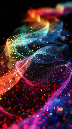 3D rendering of bright multi-colored particles fill the space with jets of energy and light. Shiny colorful abstract background for bright festive decoration
