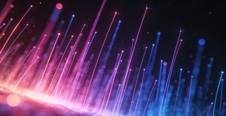 An abstract digital landscape filled with vibrant neon light trails, glowing particles, and geometric shapes in blue, green, pink, and purple.