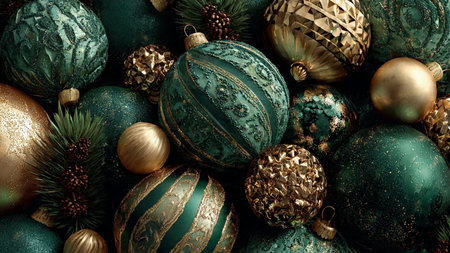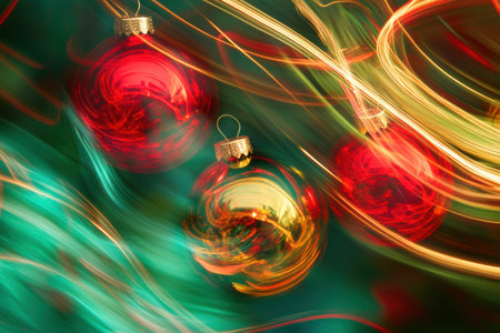 Glittering Christmas baubles in gold, green and red with dynamic light streaks, creating a festive and magical atmosphere. Bright holiday decorations glowing with sparkle and winter celebration spirit