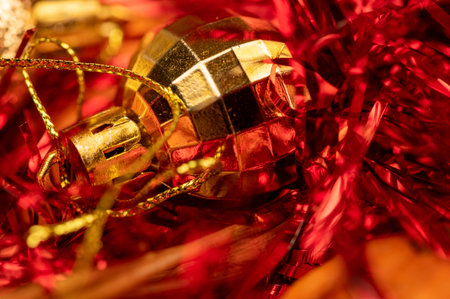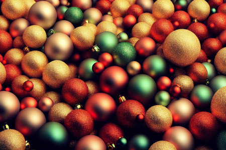 Christmas baubles background, close-up, top view.