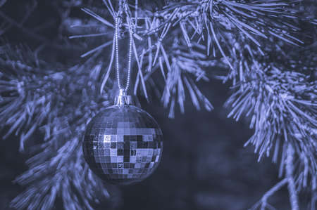 A shiny glass ball hangs on a branch of a Christmas tree. Colored in trendy color of year 2022 Very Peri. Selective focus, copy space.