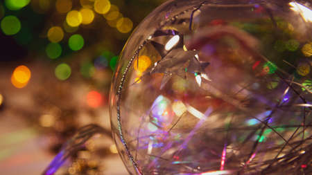 Abstract New Year's, Christmas blurred background, bokeh. Glass ball on a background of garlands and ornaments, close-up.