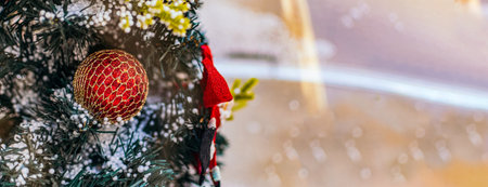 Close up of Christmas tree with red ornament banner. still life