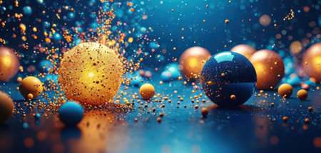 Colored particles with blue background, 3d rendering. Computer digital drawing.