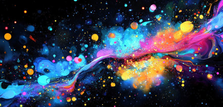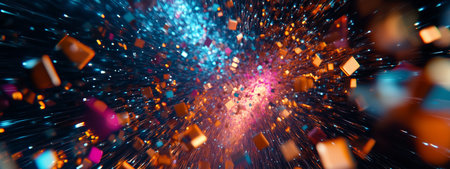 Abstract colourful particles explosion on blue background.