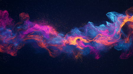 Abstract colorful particles swirling in deep purple space, forming glowing flowing trails and soft jelly-like structures.