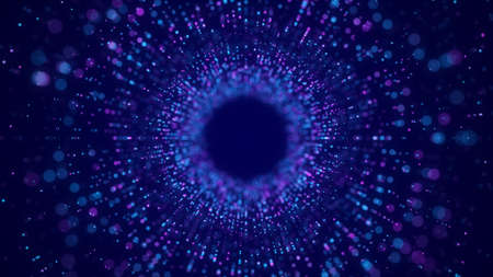 Cyber tunnel consisting of moving glowing points. Futuristic infinite space background. Concept of data transfer in cyberspace. Hi-tech illustration. 3d rendering.