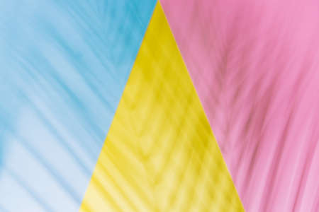 Shadows of palm leaf on geometry background of yellow, pink and blue colors. Flat lay style