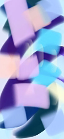 Abstract color field features gradient hues of blue, pink, yellow, and white blending softly