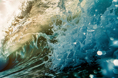 Captivating turquoise wave with sparkling reflections, showcasing ocean energy and dynamic water movement