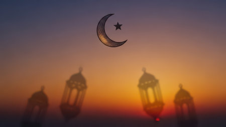 The image depicts the silhouettes of mosque minarets against a vibrant sunset sky. A crescent moon and a star are prominently displayed above the minarets, creating a serene and spiritual atmosphere.