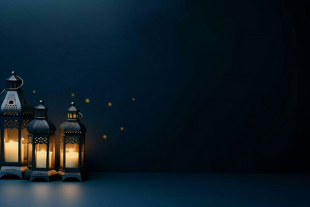 Feast of sacrifice, one of the two main Muslim holidays Eid al-Adha, religious traditional light culture arabic musulman spirituality, banner copy space background lamp
