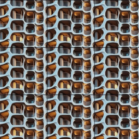 Close-up of a modern building facade featuring a repeating grid pattern with rounded openings. The facade has a light color with a slight shadow effect. High quality photo