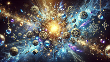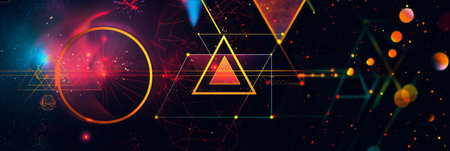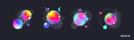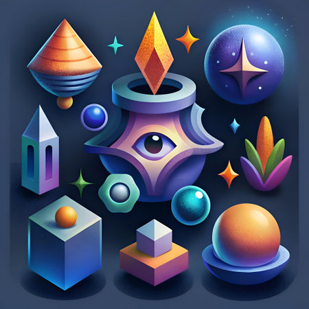 A vibrant and abstract illustration featuring a collection of geometric shapes. orbs. and stars in a cosmic style. Perfect for digital art. graphic design. and futuristic themes.
