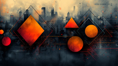 A digital artwork that combines abstract geometric shapes with an urban skyline. A mix of geometric shapes, including squares, circles, and triangles, prominently displayed against a backdrop of a cityscape