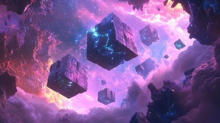 Floating cubic structures creating a futuristic space station, with a cosmic backdrop.