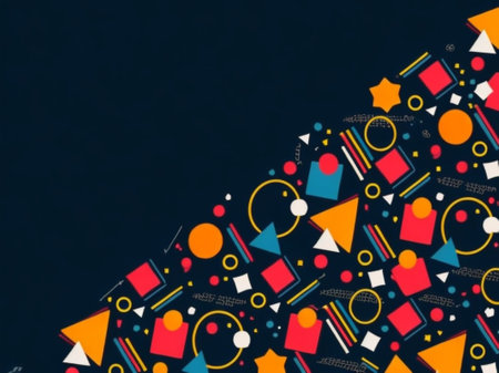 A visually striking arrangement of colorful geometric shapes and icons on a warm gradient background, showcasing modern digital design trends and artistic expression.